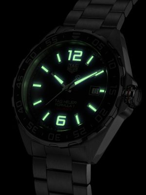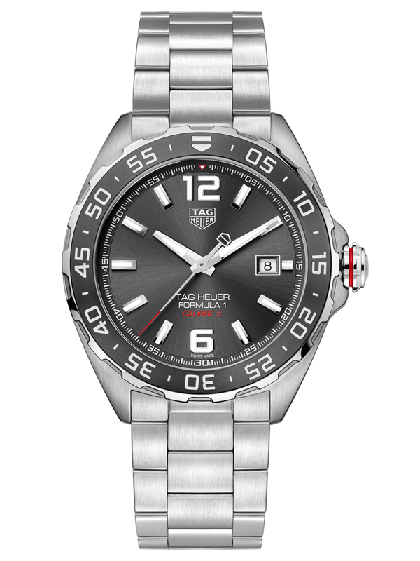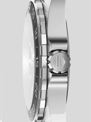Ανδρικό ρολόι TAG Heuer με κάσα και μπρασελέ από ανοξείδωτο ατσάλι, κεραμική στεφάνη μονής κατεύθυνσης και γκρι καντράν. Διαθέτει αυτόματο μηχανισμό Calibre 5 που εκτελεί 28.800 ταλαντώσεις την ώρα και αυτονομία 38 περίπου ωρών.