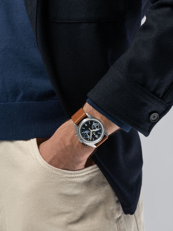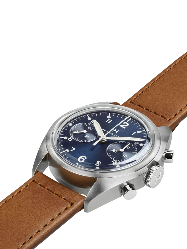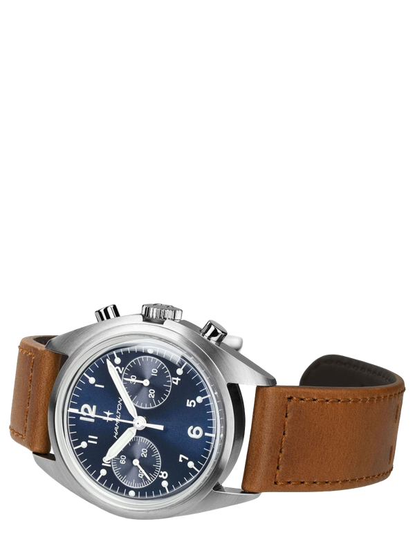 €127.5 x 18 άτοκες Ανθεκτικό και αξιόπιστο, το Khaki Pilot Pioneer Mechanical Chronograph αποτίει φόρο τιμής στα κλασικά στρατιωτικά αεροπορικά ρολόγια της Hamilton. Τροφοδοτείται από τον αποκλειστικό, κουρδιστό στο χέρι μηχανισμό H-51-Si, προσφέροντας απόθεμα ενέργειας 60 ωρών και εντυπωσιακό καντράν Aviation Blue με σατινέ ηλιακή υφή.