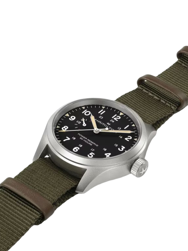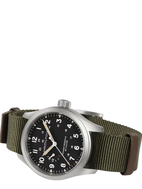 Το Khaki Field Mechanical Power Reserve 40mm τιμά τον κλασικό σχεδιασμό και τη βασική λειτουργικότητα της οικογένειας Khaki, ενώ παράλληλα εισάγει σύγχρονα χαρακτηριστικά και την πιο πρόσφατη τεχνολογία και καινοτομία στην ωρολογοποιία. Με τον νέο χειροκίνητο μηχανισμό H-23, που αναπτύχθηκε από την ETA αποκλειστικά για την Hamilton, επιτρέπει (για πρώτη φορά) την απεικόνιση του αποθέματος ενέργειας των 80 ωρών απευθείας στο καντράν. Συνδυασμένο με ένα ανθεκτικό χακί πράσινο λουρί NATO, το μαύρο καντράν εμφανίζει περήφανα την ένδειξη power reserve 80 hours, καθώς και τα F (full) και E (empty), υπογραμμίζοντας αυτή τη μοναδική και πρακτική λειτουργία.