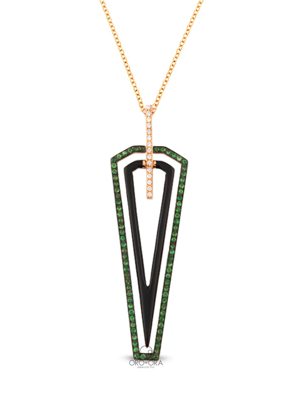 Κολιέ Ροζ Χρυσό Κ18 με Διαμάντια, Τσαβορίτες και Σμάλτο. Αναβαθμίστε πολυτελώς τις επίσημες εμφανίσεις σας φορώντας τη λάμψη των πολύτιμων και ημιπολύτιμων λίθων.Διαλέξτε το κατάλληλο κόσμημα για εσάς ή για δώρο ανακαλύπτοντας τις ολοκληρωμένες συλλογές μας σε μοντέρνα και κλασικά σχέδια. Κάθε κόσμημα συνοδεύεται από πιστοποιητικό και εγγύηση ποιότητας PRINTEZIS.