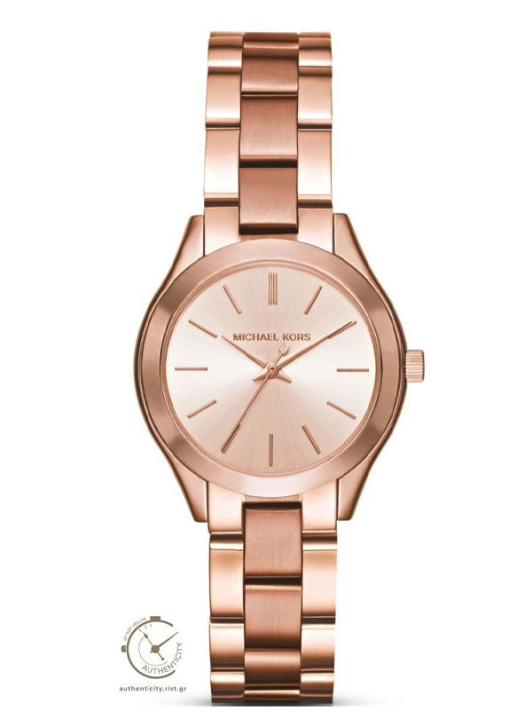 Με iconic design το ρολόι Michael Kors Mini Slim Runway θα μεταμορφώσει τις καθημερινές σας εμφανίσεις. Διαχρονικό και κομψό εντυπωσιάζει με τη θέρμη του ροζ χρυσού και το minimal ροζ χρυσό καντράν.