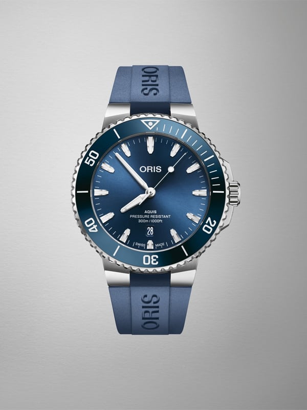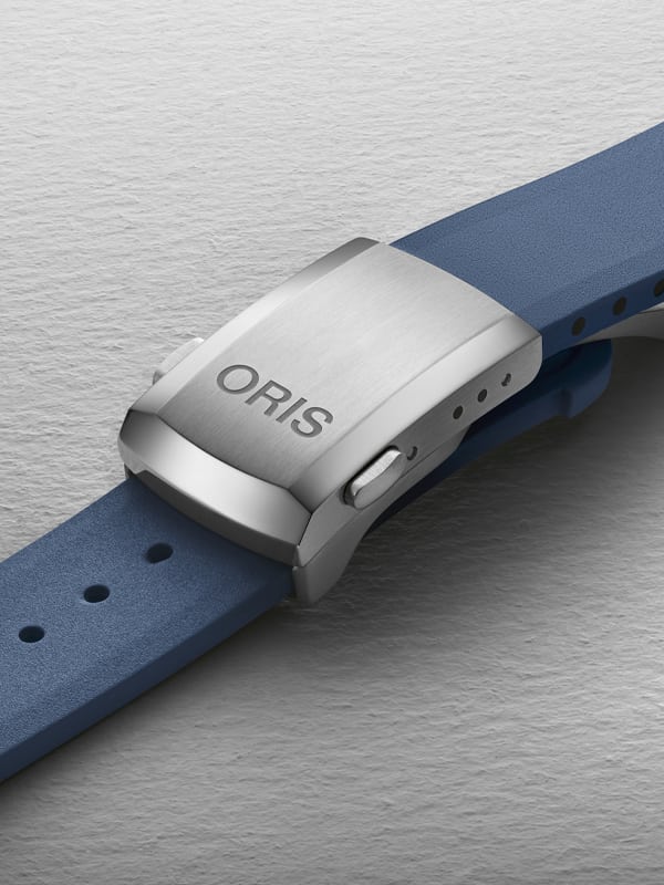 Ανδρικό αυτόματορολόι της εταιρίας Oris με καουτσούκ λουράκι σε μπλε χρώμα. Διαθέτει αυτόματο μηχανισμό και στεγανότητα στα 300 μέτρα.