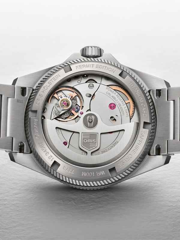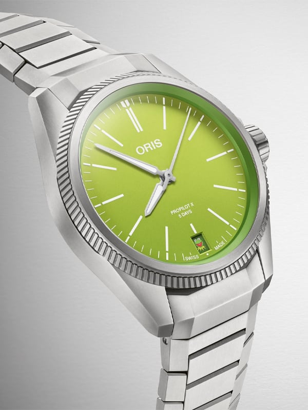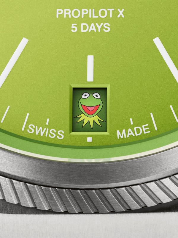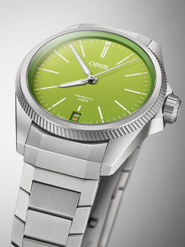 Η Oris με τεράστια χαρά λοιπόν παρουσιάζει το νέο ProPilot X Kermit Edition. Βασίζεται στο ProPilot X Calibre 400 39 χιλιοστών από τιτάνιο, μόνο που έχει πράσινο καντράν - και μία λεπτομέρεια. Την πρώτη μέρα κάθε μήνα, στην ένδειξη ημερομηνίας στο 6, θα εμφανίζεται το emoji του Kermit. Η ημέρα του Kermit ενθαρρύνει τους ανθρώπους να παίρνουν την ζωή λιγότερο σοβαρά. Να διασκεδάζουν. Και η Oris διασκεδάζει με απόλυτη σοβαρότητα.