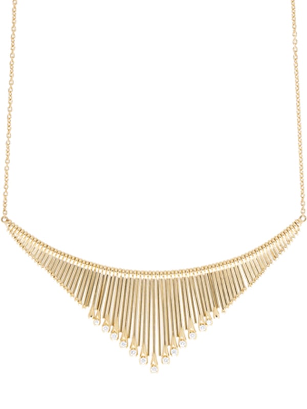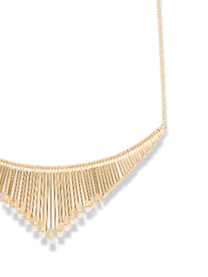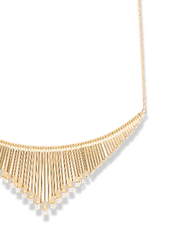 Κολιέ από χρυσό Κ18 από το brand Peruffo, με ρυθμιζόμενη αλυσίδα, κινητά στοιχεία και διαμάντια. Το τελικό τμήμα των κινητών ράβδων καταλήγει, σε αυτήν τη special edition, σε ένα μικρό διαμάντι που αντικαθιστά τη χρυσή σταγόνα.