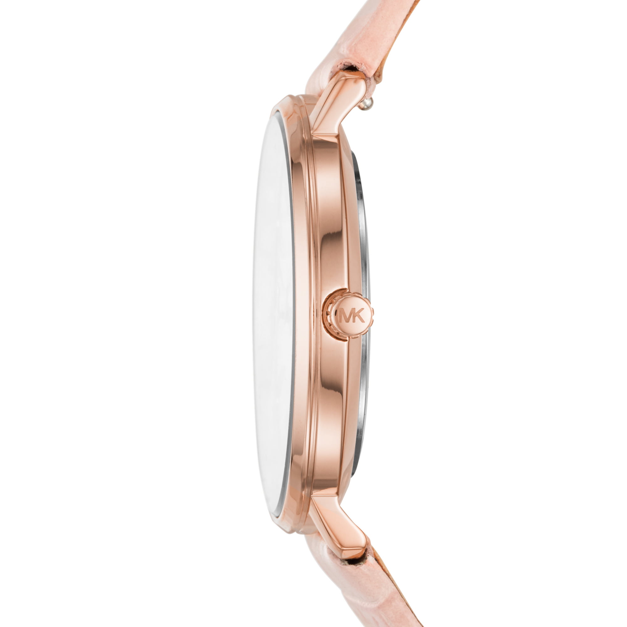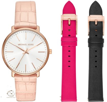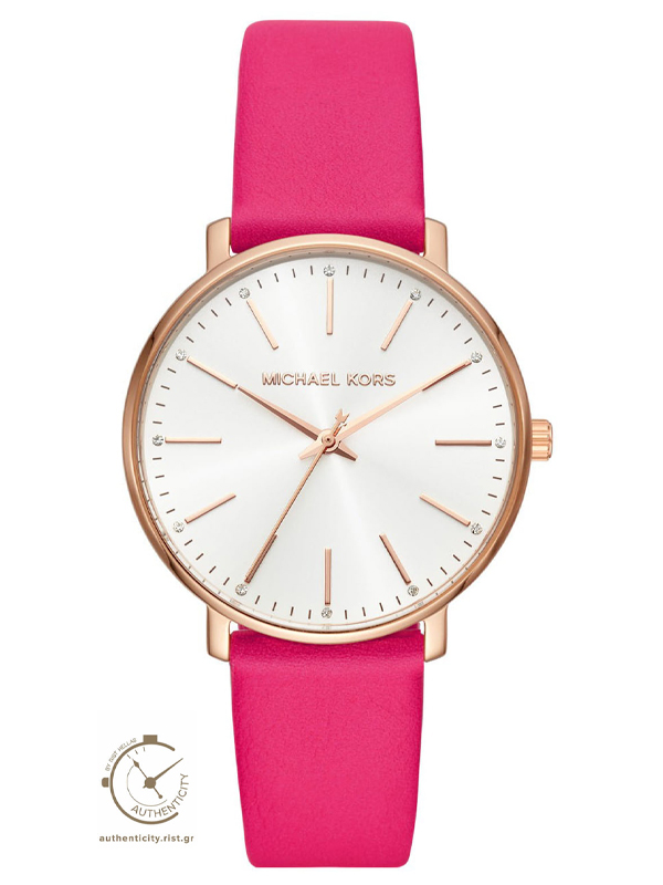 Michael Kors Pyper ,γυναικείο ρολόι με λευκό καντράν, ροζ χρυσή ανοξείδωτη ατσάλινη κάσα και ροζ δερμάτινο λουράκι.