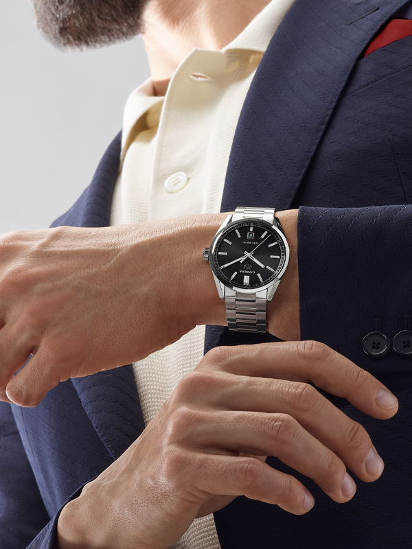 €154.17 x 24 άτοκες Confident and classic. With great classic style, this 39mm three-handed automatic TAG Heuer Carrera shows striking luxury, ready for on-the-go wearers. The black azurage dial brings out the luminescent rhodium-plated hands, markers, and the applied TAG Heuer logo. Confidently driving the watch is a Calibre 5, with a date display at six o'clock. The automatic movement is visible through the sapphire caseback.